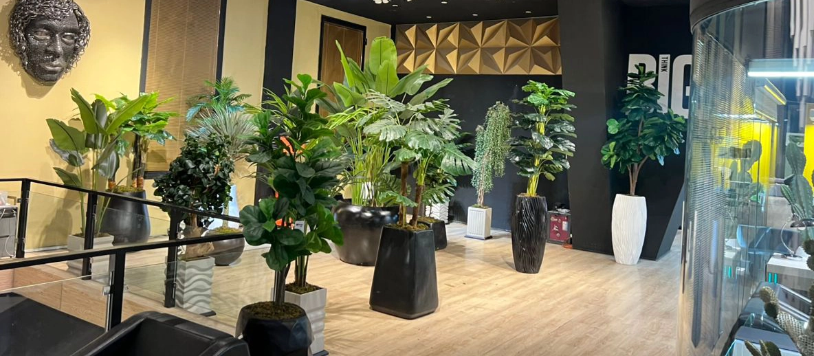 درختچهها و گلدانهای دکوراتیو: استفاده از درختچههای مصنوعی با ظاهر کاملاً طبیعی (مانند فیکوس، نخل یا بامبو) در گلدانهای مدرن، حجم و بعد به فضا میدهد و گوشههای خالی اتاق را زنده میکند.