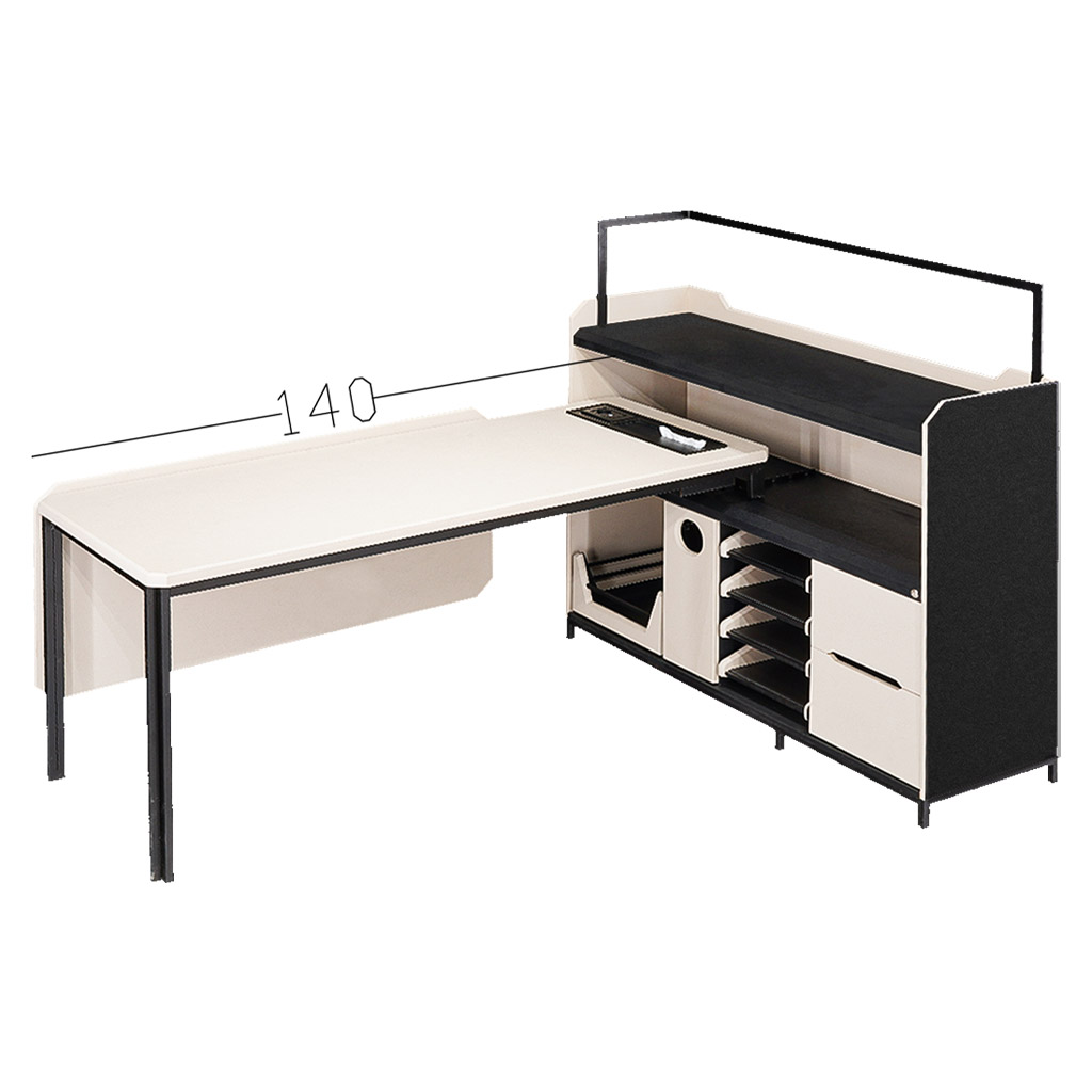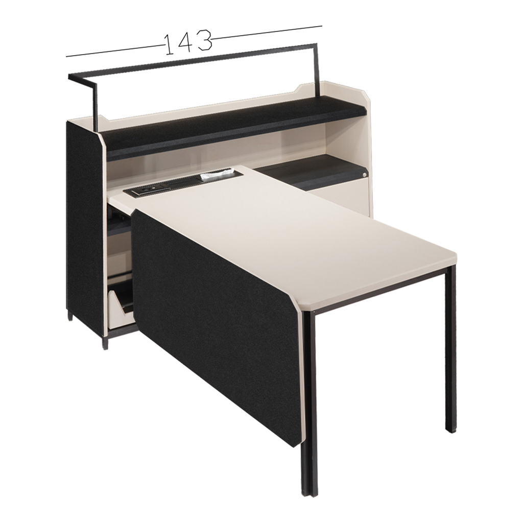 - بخش ال دارای شلف، کازیه، محفظه وسایل و کشو فایل، ابعاد طول ۱۸۳عمق ۴۰ارتفاع ۱۳۵